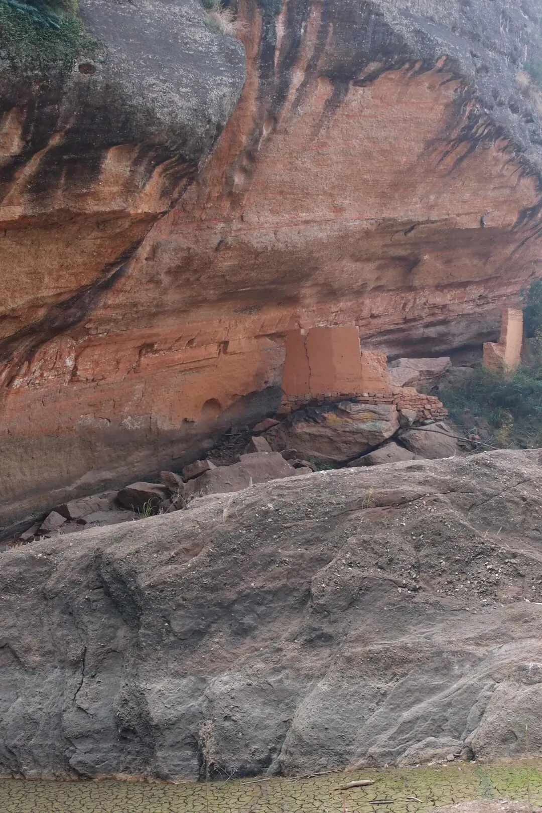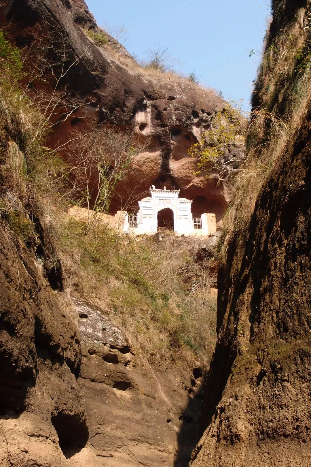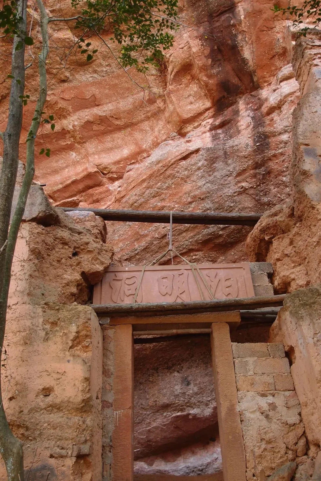 到了东龛水库,小林一伙人已经到达,正在湖边用无人机拍摄。我先来到湖边的山洞,山洞还有废弃的夯土建筑。建筑的门上面有一个新的匾额,写着阳明洞。