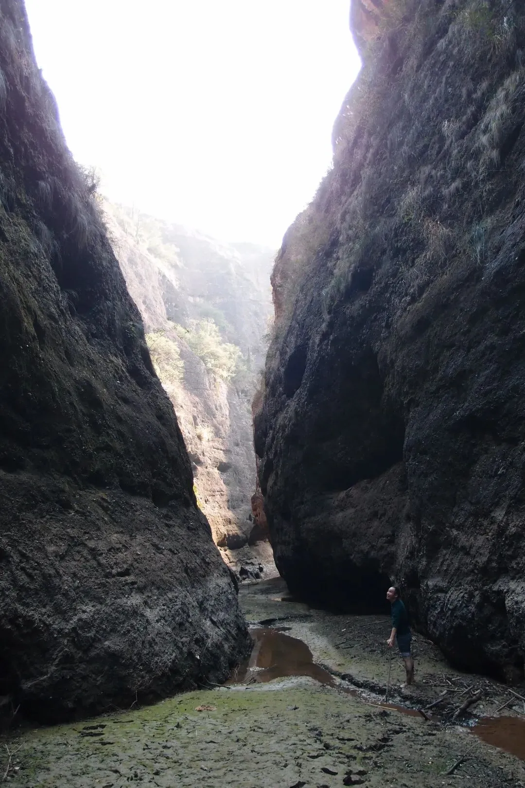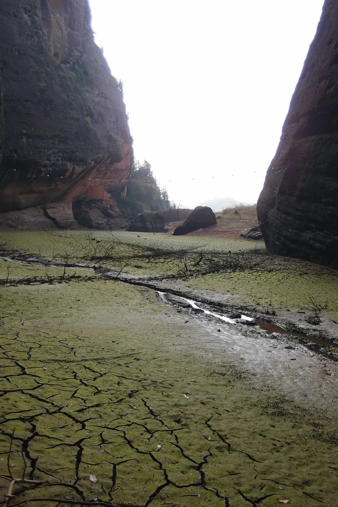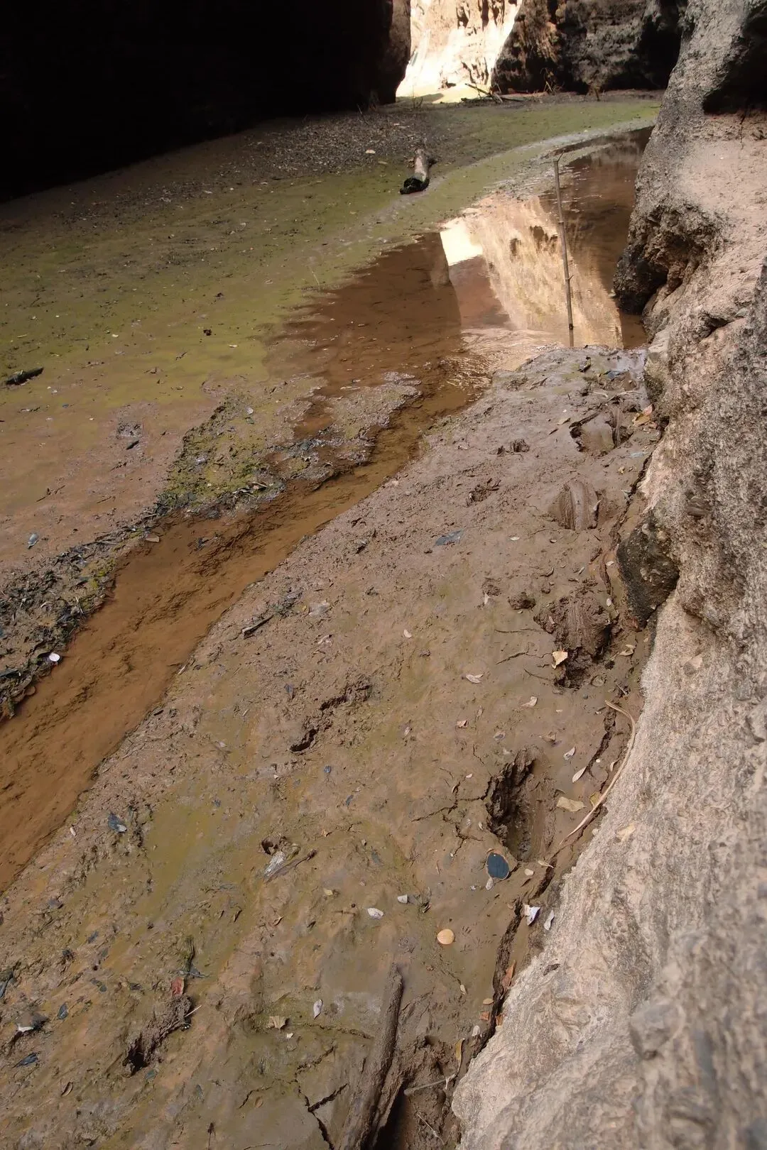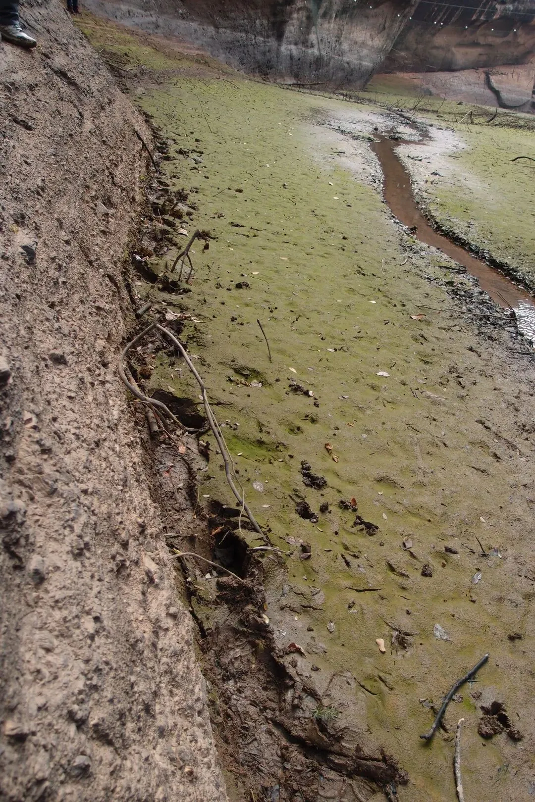 开始往峡谷里走,看似干涸的湖面还有一条细细的溪流,溪流两边的泥巴并没有干透,还是非常软的。