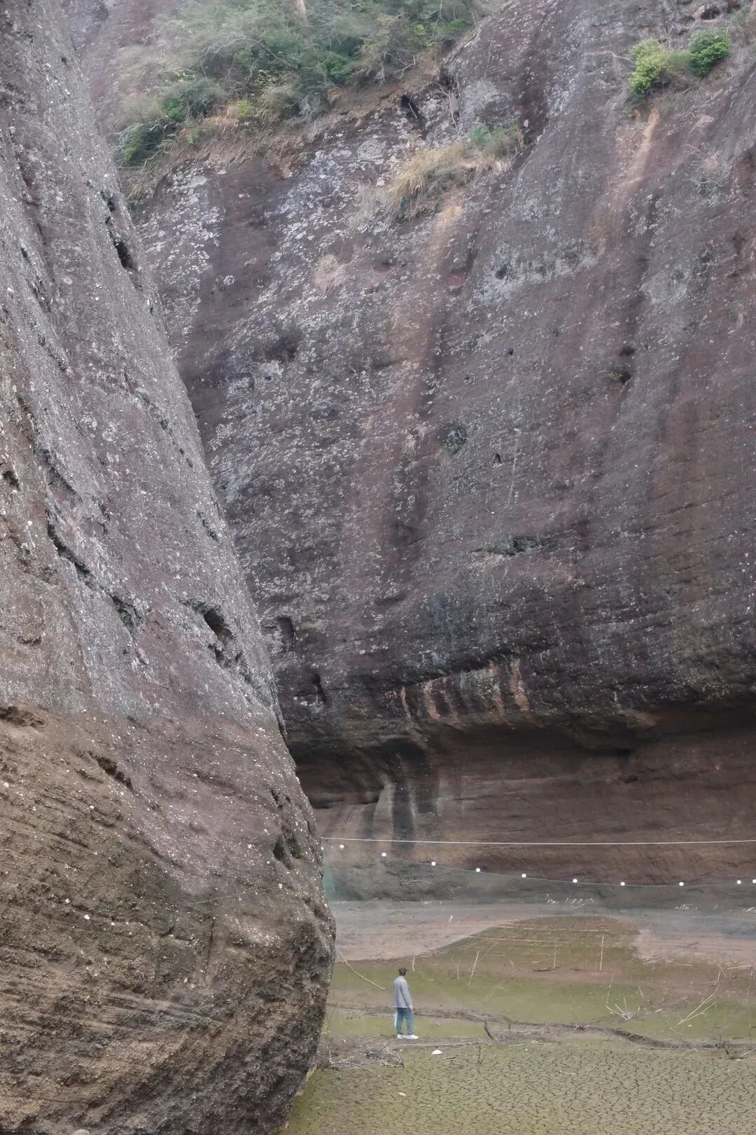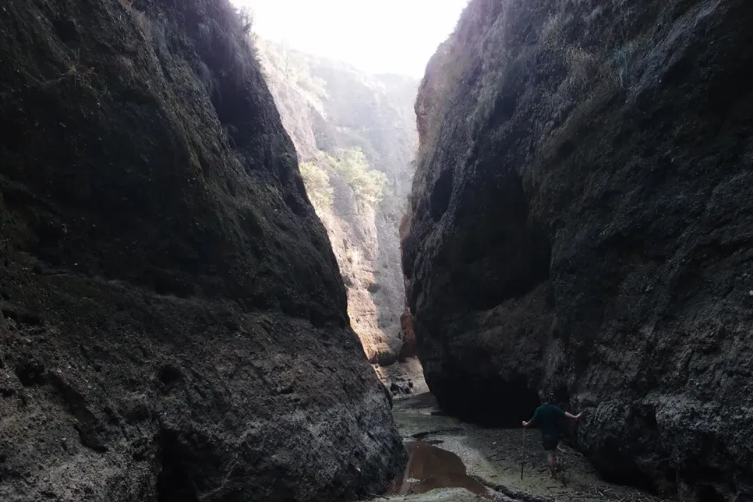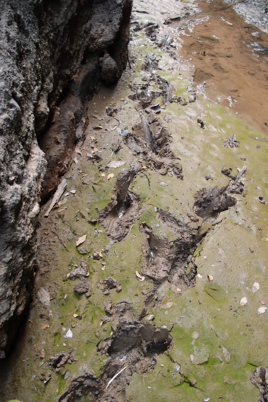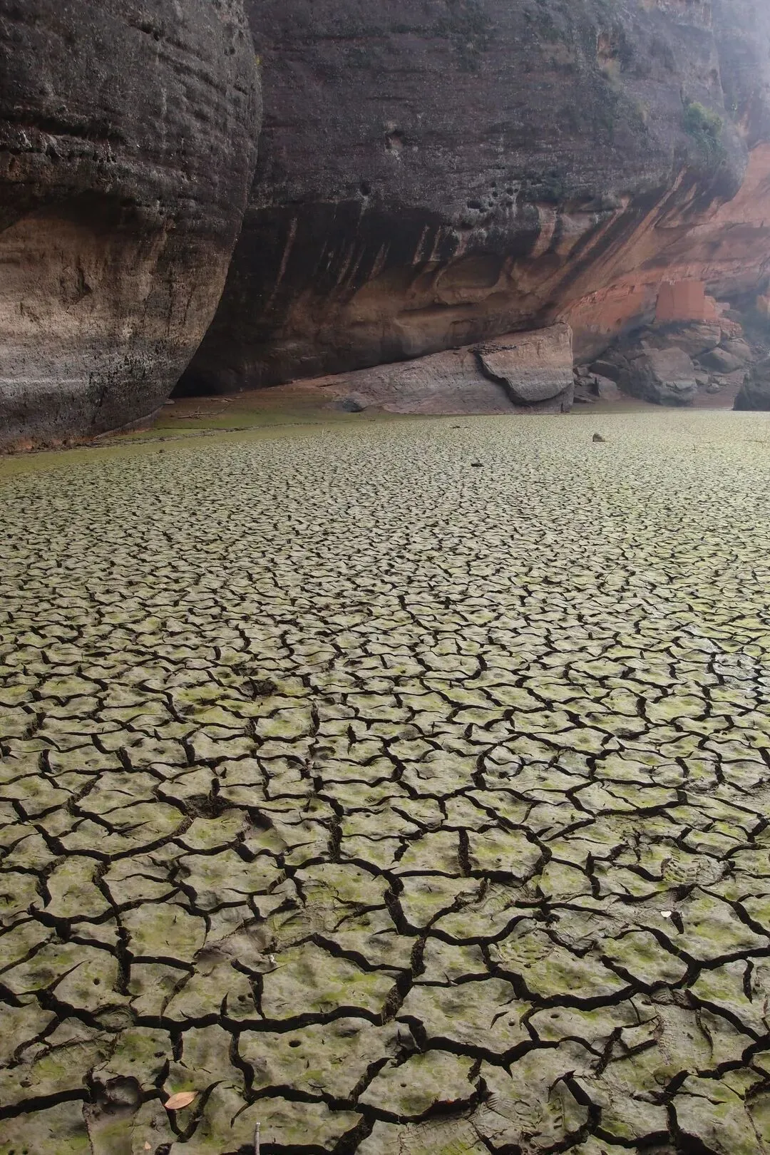 开始往峡谷里走,看似干涸的湖面还有一条细细的溪流,溪流两边的泥巴并没有干透,还是非常软的。