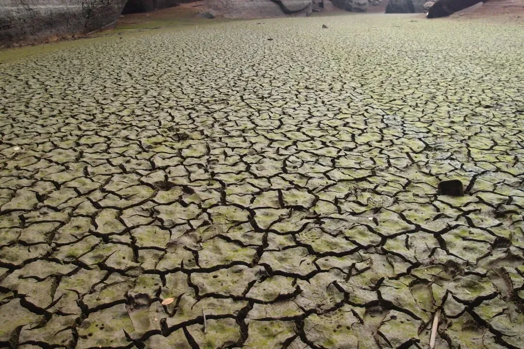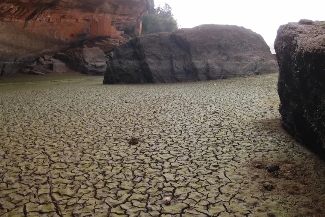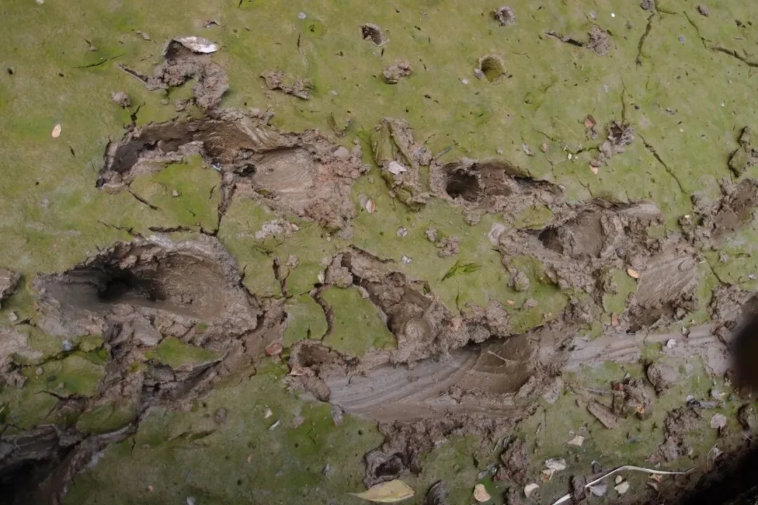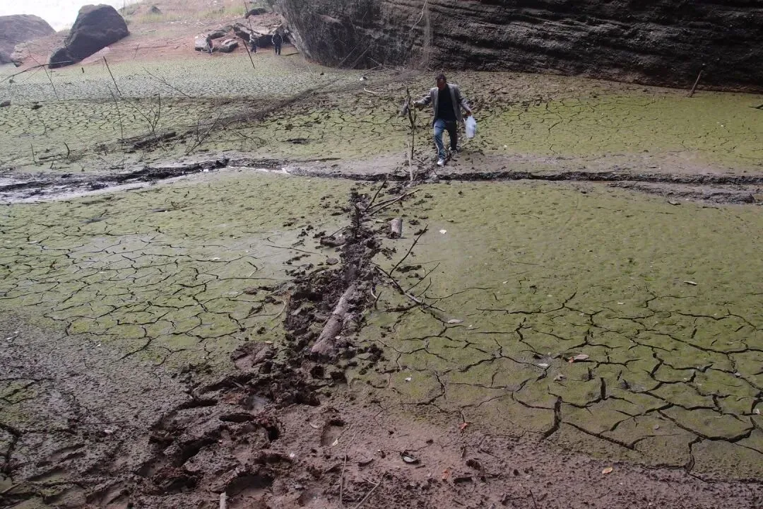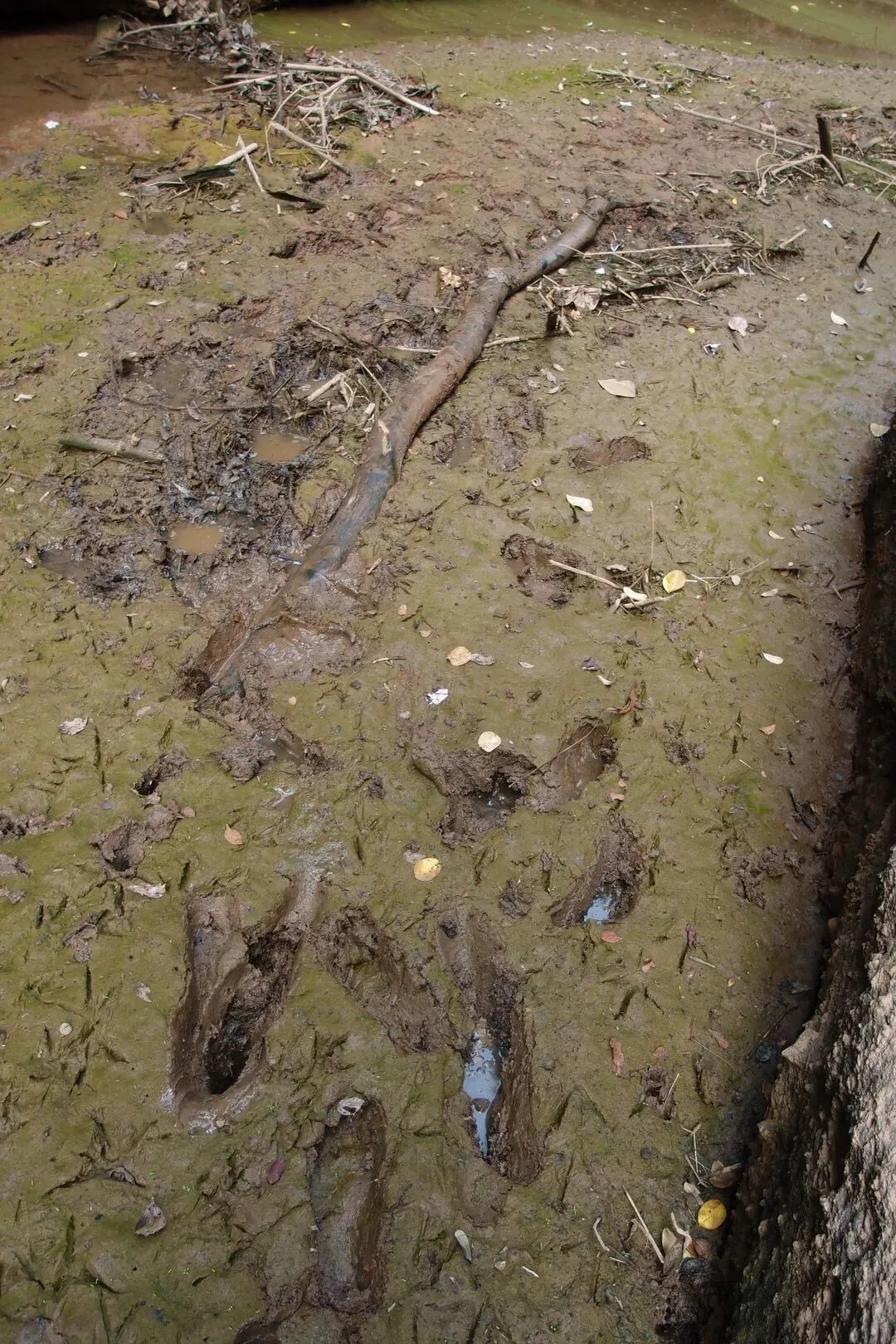 开始往峡谷里走,看似干涸的湖面还有一条细细的溪流,溪流两边的泥巴并没有干透,还是非常软的。