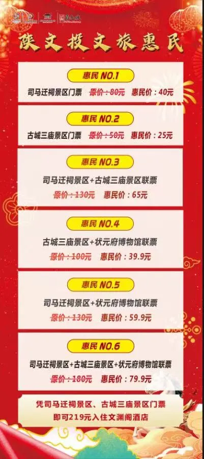 穿汉服游古祠更有惊喜,芝秀桥汉服馆8折就能get全套汉服+头饰+道具,在司马古道、祭祀广场拍照后还能参与抽奖。持两大景区任意门票入住文渊阁酒店享219元房价(标间或大床房),同时元旦期间两大景区本地市民凭身份证免费,外地游客5折优惠,性价比直接拉满!