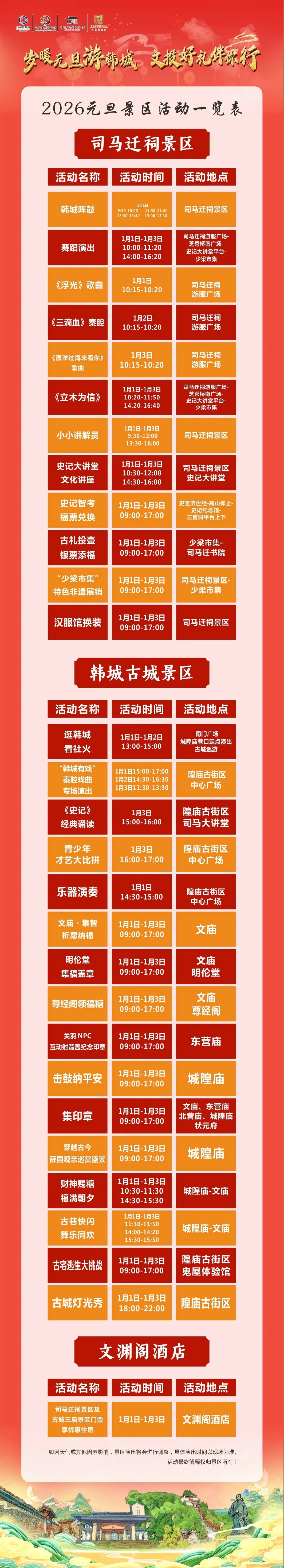 这个新年,不必远行!来司马迁祠景区,闯关卡、集福票、学历史、赏非遗,在千年文脉中开启元气满满的2026。穿上汉服漫步古道,带着孩子体验汉服换装,和家人打卡非遗市集,让厚重的历史变得可玩可学,让新年的美好回忆有迹可循~