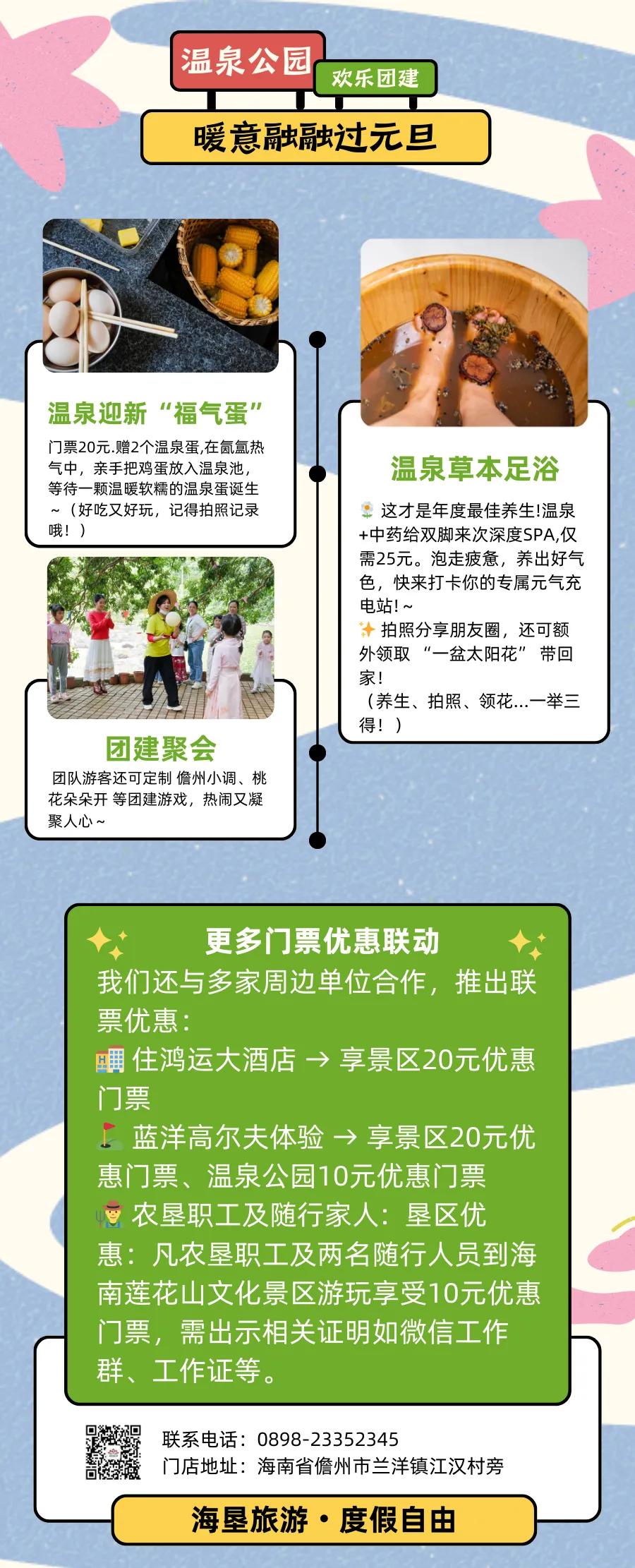 海南蓝洋温泉公园位于海南省儋州市兰洋镇,山庄内拥有海南水质最佳的氡泉资源,氡平均含量全国最高(超过660BQ/L),其温度高达93.7℃,可将食材泡熟直接食用。元旦期间20 元门票附赠 2 个温泉蛋,亲手放入温泉池慢煮,暖心又好玩;25 元体验温泉草本足浴,泡走疲惫焕活元气,拍照分享朋友圈还能领取太阳花一盆。团队可定制儋州小调、桃花朵朵开等团建游戏。