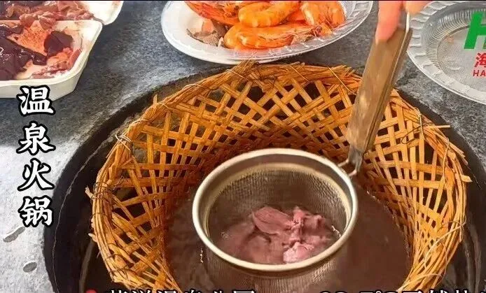 中午:到蓝洋温泉山庄,品尝温泉火锅,享受用高温氡泉泡熟的鲜嫩食材。