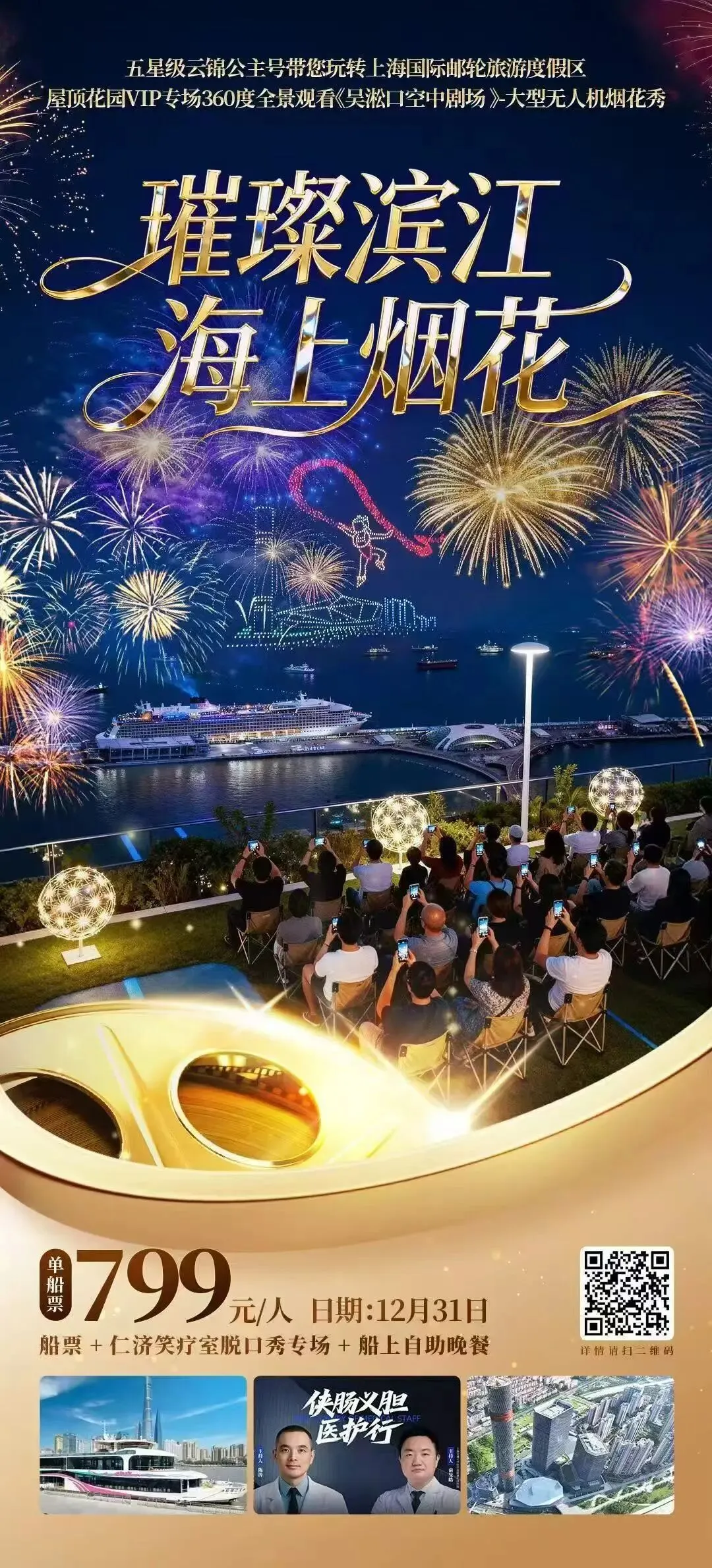 游客将在摇曳的灯火与流淌的江水中,完成从“城市之心”外滩到“邮轮门户”宝山的穿越。在船上享用自助晚餐,并观看独特“笑辽室”脱口秀,在欢笑中开启夜晚。抵达宝山滨江码头后,游客将直接步入上海国际邮轮旅游度假区的指定观景区,完美衔接“吴淞口空中剧场”等重磅活动,最佳视角观赏当晚震撼的千架无人机主题表演与大型烟花秀,尊享水陆联动的至尊礼遇。