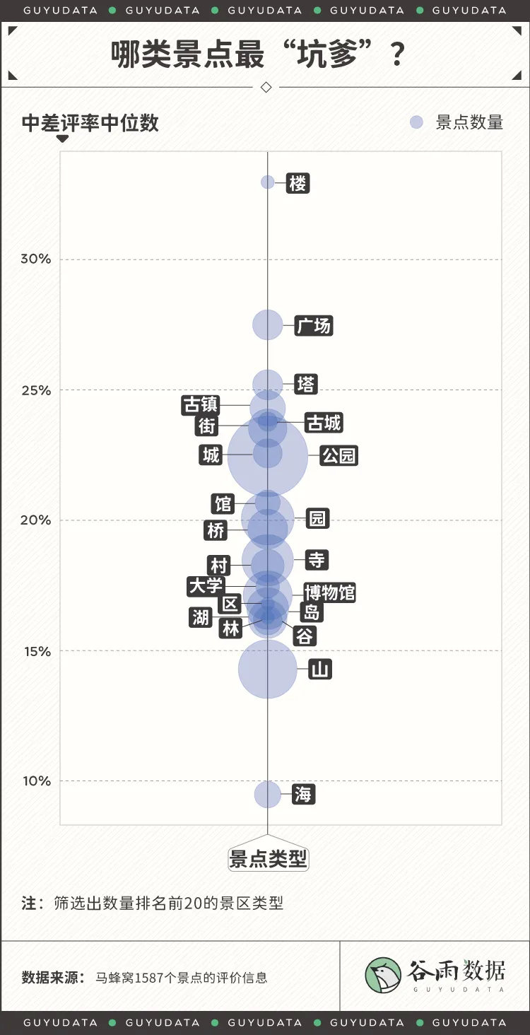 在中差评率排行榜名列前十的,基本都是“广场”、“公园”之类的人造景点。其中,带“楼”字的景点尤其遥遥领先。