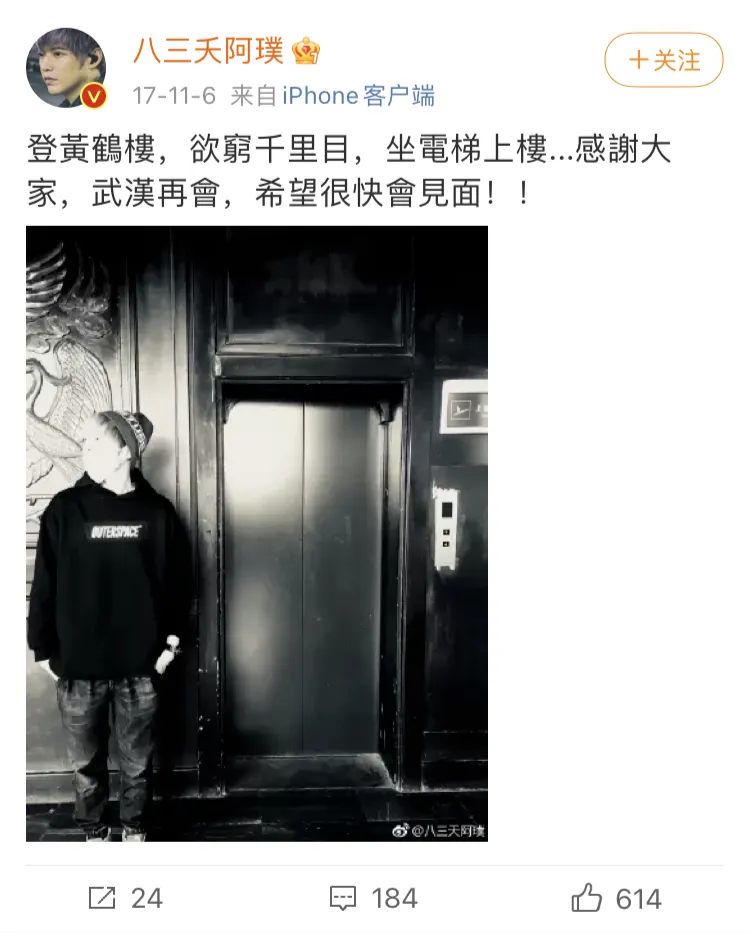 台湾乐队“八三夭”成员阿璞就曾调侃黄鹤楼里的电梯 | @八三夭阿璞