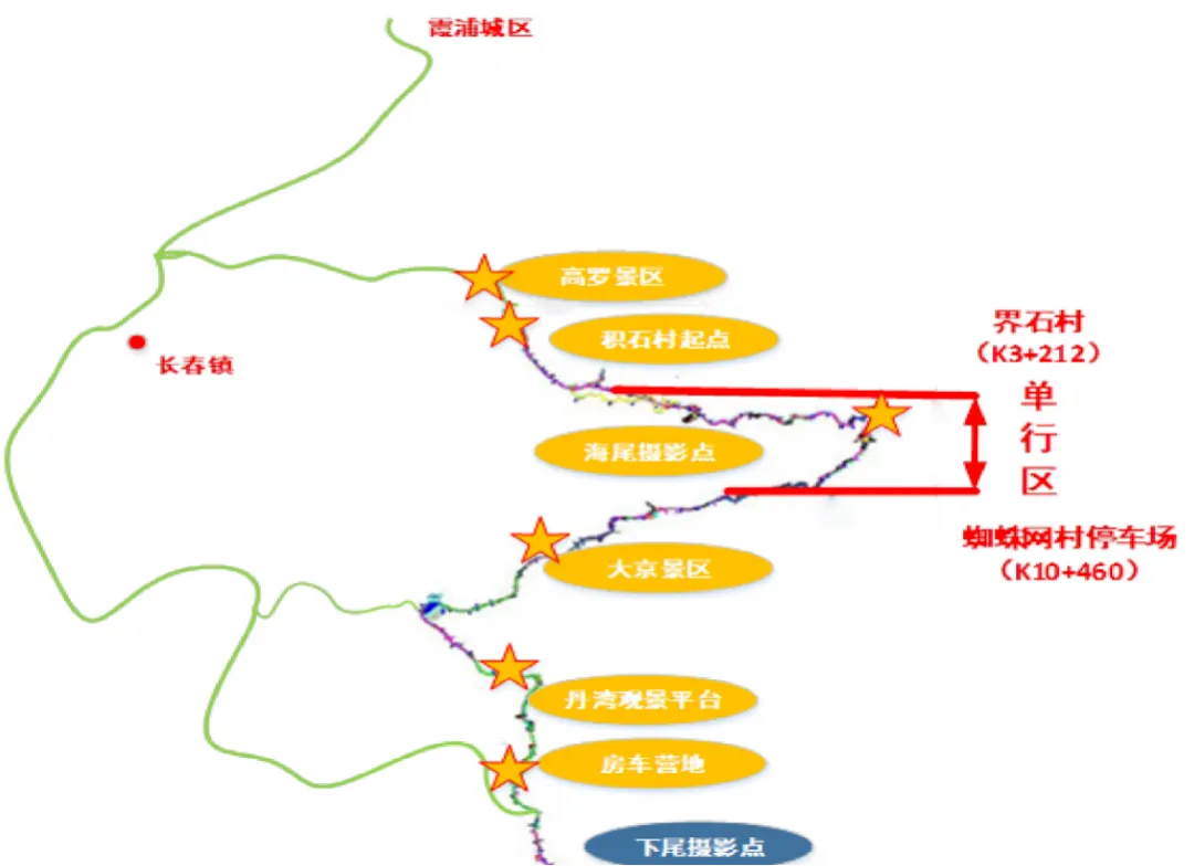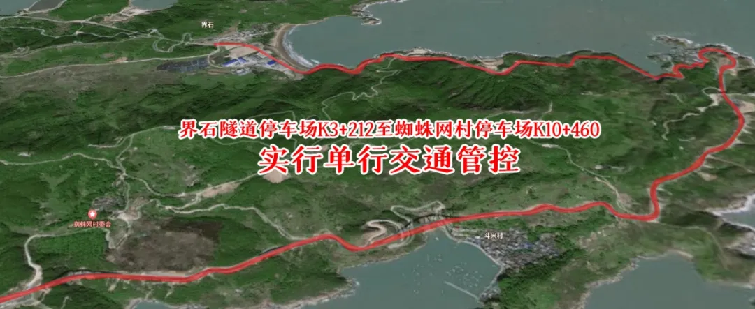 (1)界石隧道停车场K3+212至蜘蛛网村停车场K10+460实行单向通行交通管制(管制时间:09:00-18:00)