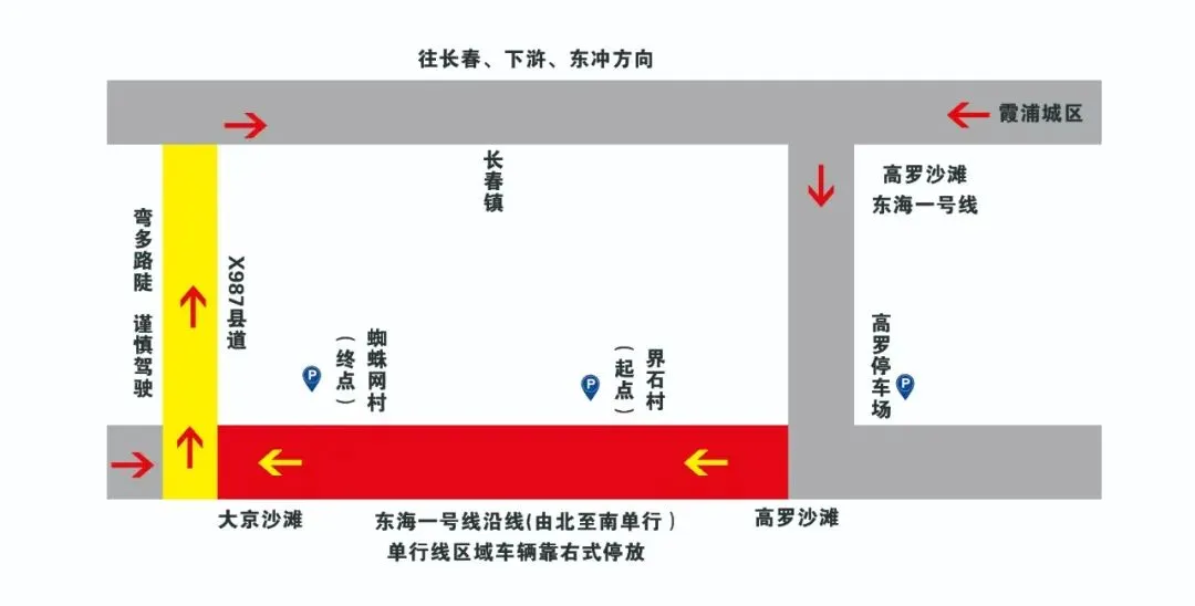 界石隧道停车场K3+212(起点)至蜘蛛网村停车场K10+460(终点)设定诱导边界,对进入“东海1号”线公路车流实行单行交通管控等举措。