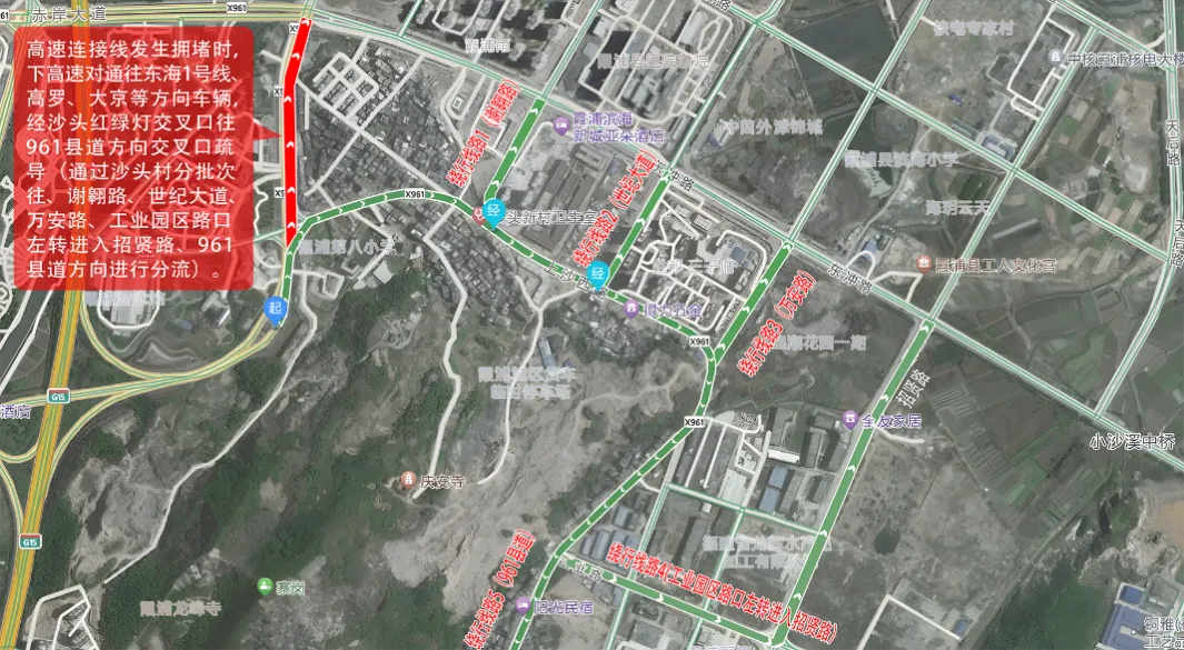 高速连接线发生拥堵时,下高速对通往“东海一号”线、高罗、大京等方向车辆,经沙头红绿灯交叉口往961县道方向交叉口疏导(通过沙头村分批次往、谢翱路、世纪大道、万安路、工业园区路口左转进入招贤路、961县道方向进行分流)。