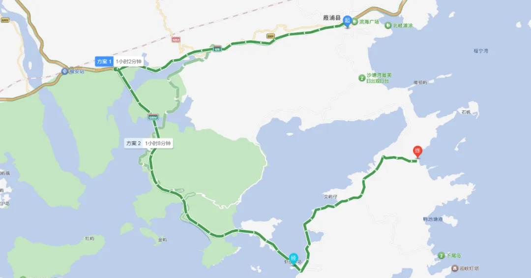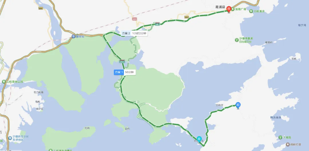 返程线路(车辆经大京、吕峡到达987县道返程回霞浦城区)。