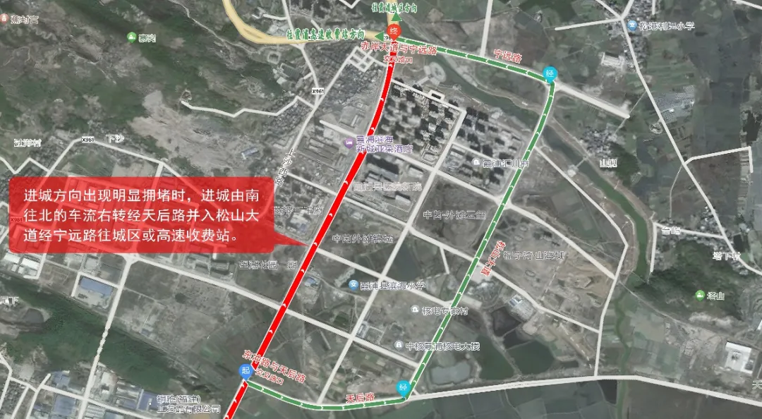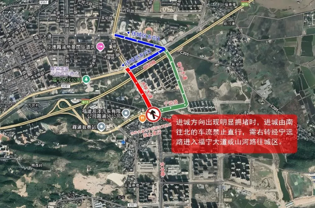 赤岸大道体育北路红绿灯路口至今源酒店红绿灯路口出现明显拥堵时,进城由南往北车辆,经宁远路并入福宁大道前往城区,主要行经福宁大道、山河路进入城区;前往霞浦高速口的车流在体育北路红绿灯路口正常左转进入高速连接线进入。