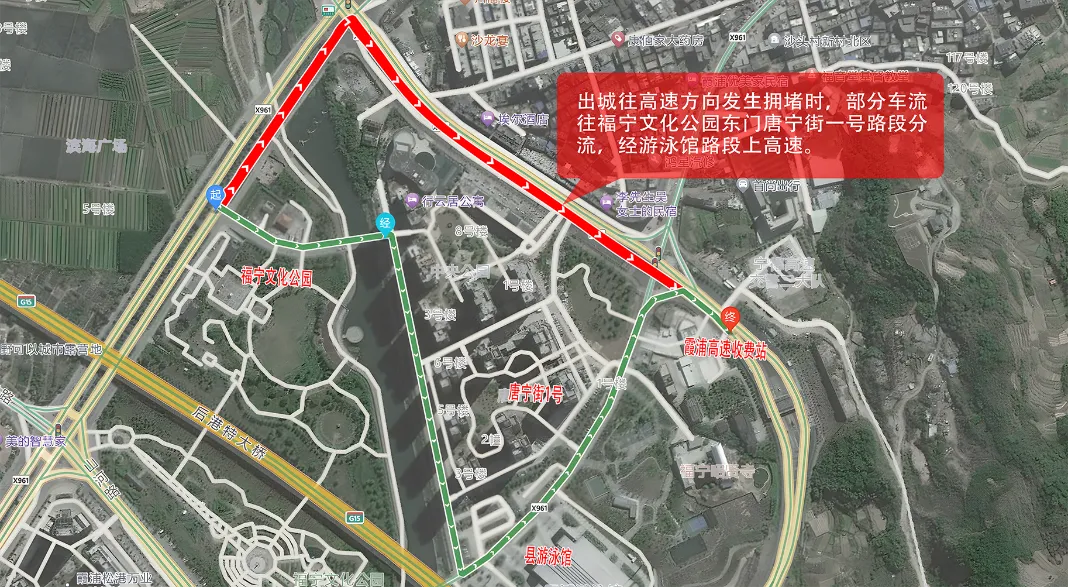 出城往高速方向发生拥堵时,部分车流往福宁文化公园东门唐宁街一号路段分流,经游泳馆路段上高速。