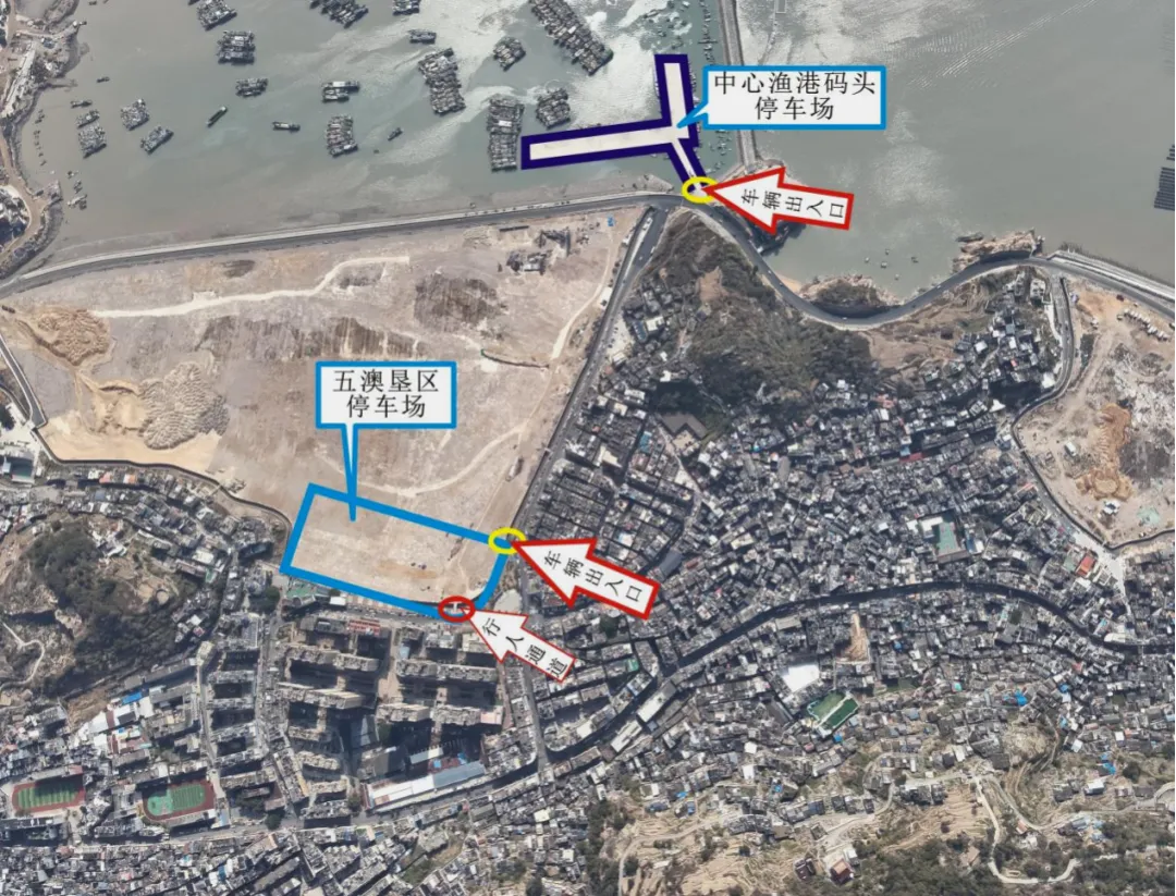 (1)镇区路段(示意图附后)①中心渔港码头停车场;②五澳垦区停车场。