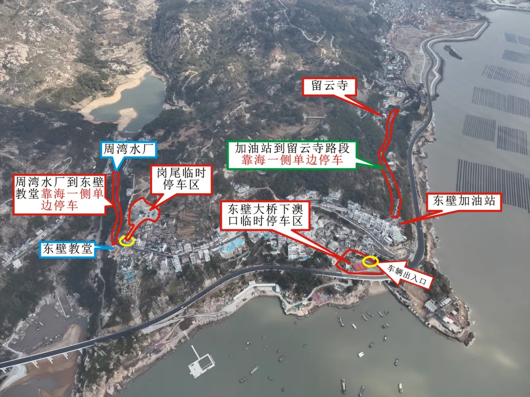 (2)东壁路段(示意图附后)①岗尾临时停车区;②东壁加油站往留云寺方向靠海一侧单边停车;③疏港公路东壁段停车(东壁大桥桥面禁停);④周湾水厂往东壁教堂靠海一侧单边停车;⑤东壁大桥下澳口临时停车区。