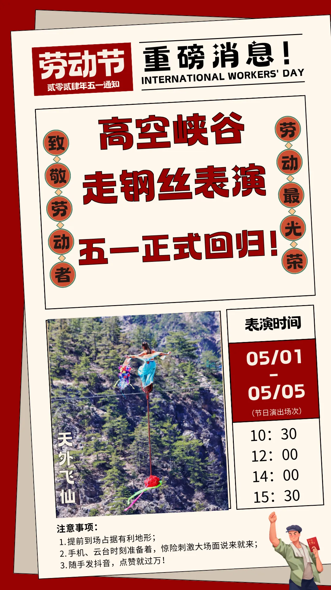 1.为回馈全国“五一”劳动模范,凭全国“五一”劳动者勋章、证书或相关证件免门票!