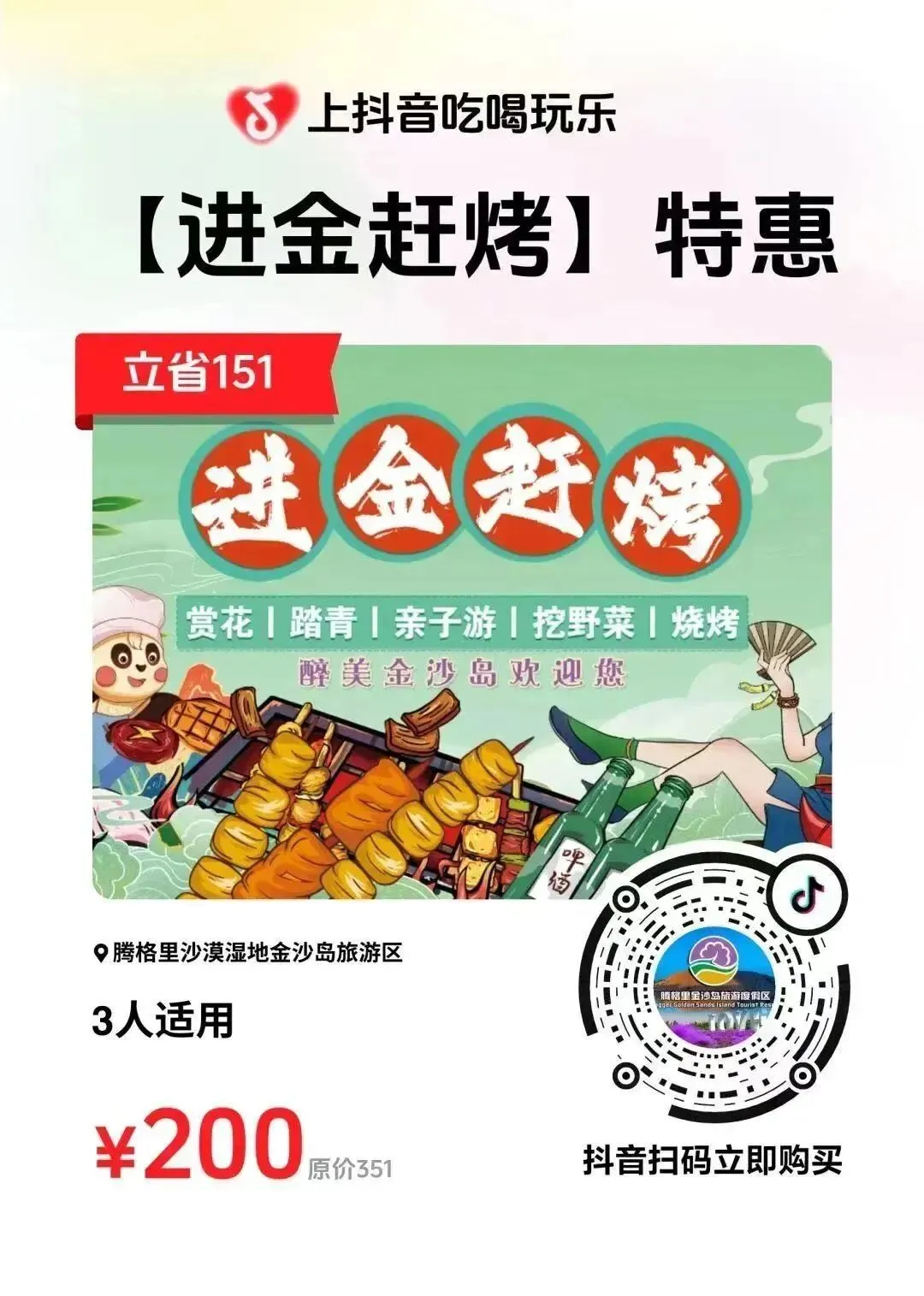 花开柳绿迎鸟归,踏青出门正当时。大漠拥长河,烧烤更惬意。游玩项目多,体验乐多多。