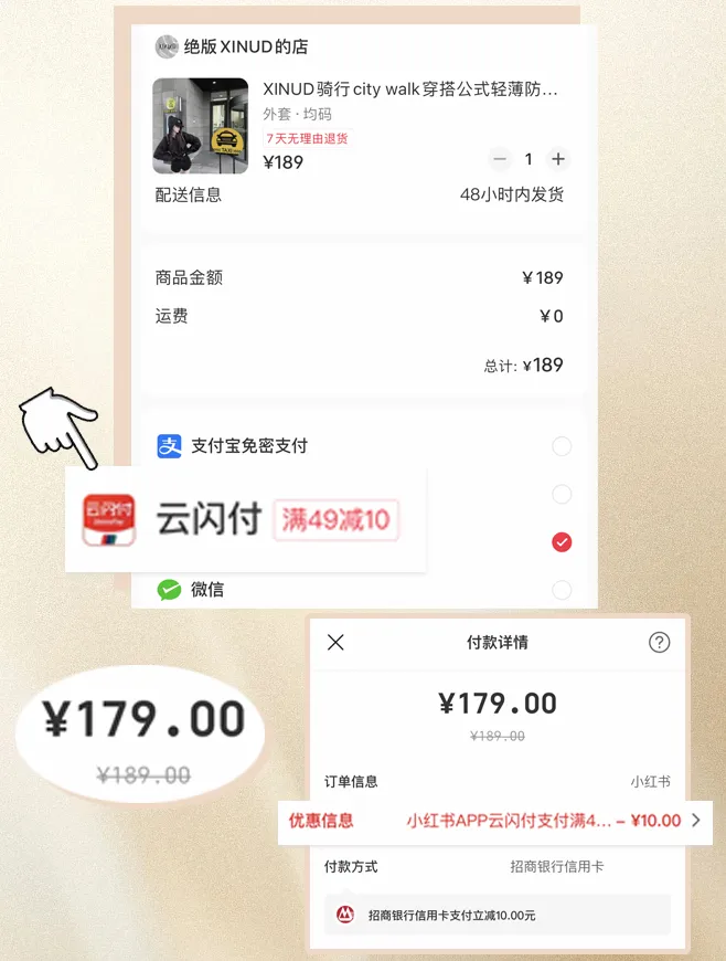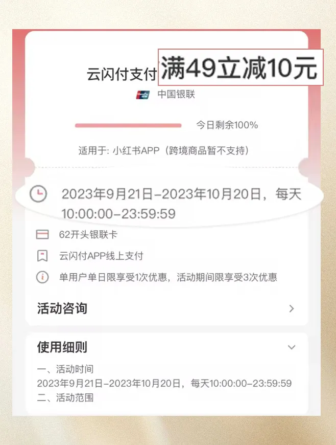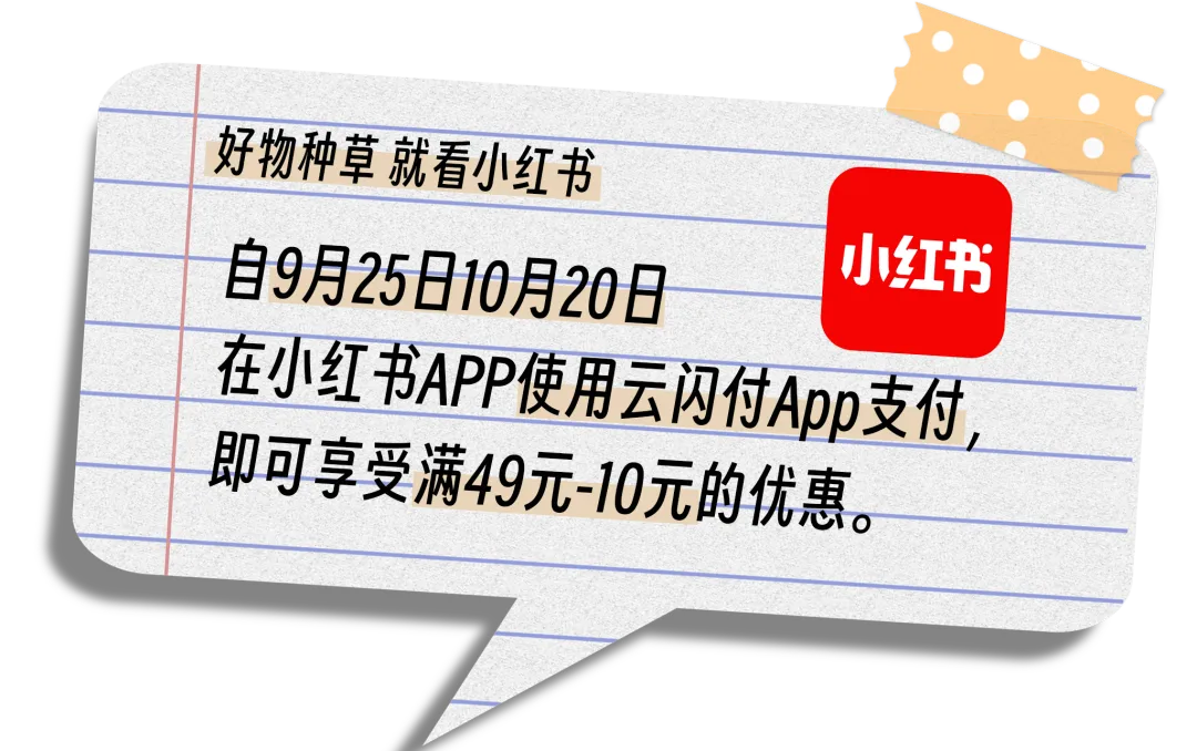 比如从9月25日至10月20日,在小红书用云闪付App即可享满49减10元的优惠,这不比咱们大促凑单凑满减香多啦?