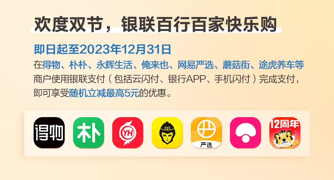 活动期间(9与25日起至12月31日)在得物、网易严选、永辉生活等App使用银联(包括云闪付、银行App、手机闪付)完成支付,也都可以享受随机立减zui高5元的优惠活动,5块钱看起来不多,但白薅的🐑毛还是很香的!商户多多,优惠多多~