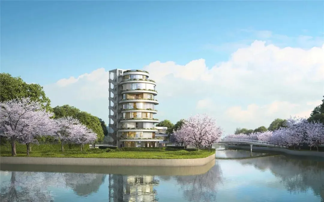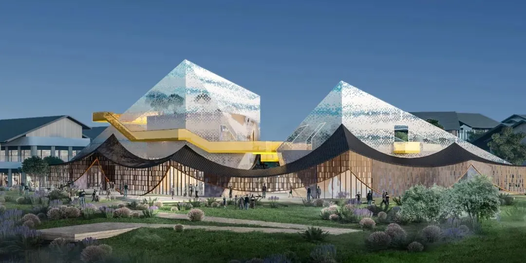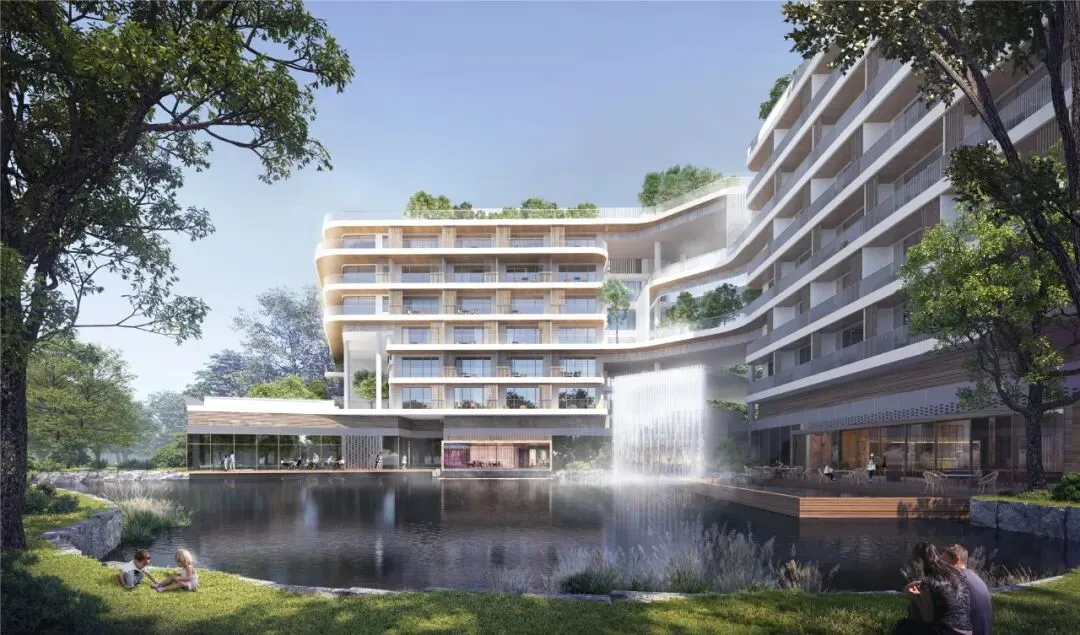 建筑大师俞挺设计, 萃取“ 远山” 与“ 屋檐” 传统江南意象, 连绵起伏, 缎带缠绕, 打造国际文化汇聚地与全球艺术朝圣地, 更将艺术理念与美学体验⾃然融⼊度假⽣活方式, 不断为未来赋予新的文化生命力。