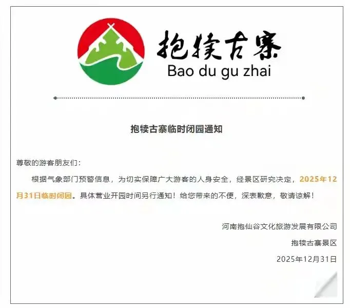 根据气象部门预警信息,为切实保障广大游客的人身安全,经景区研究决定,2025年12月31日临时闭园。具体营业开园时间另行通知!