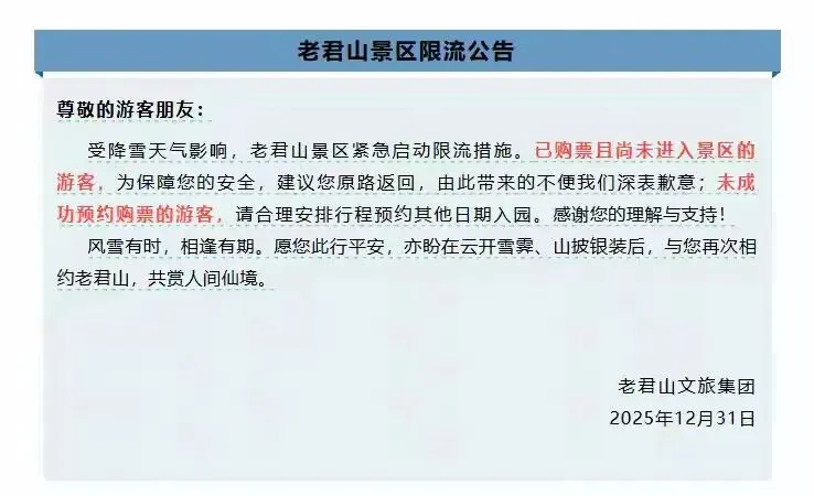 受降雪天气影响,老君山景区紧急启动限流措施。已购票且尚未进入景区的游客,为保障您的安全,建议您原路返回;未成功预约购票的游客,请合理安排行程预约其他日期入园。