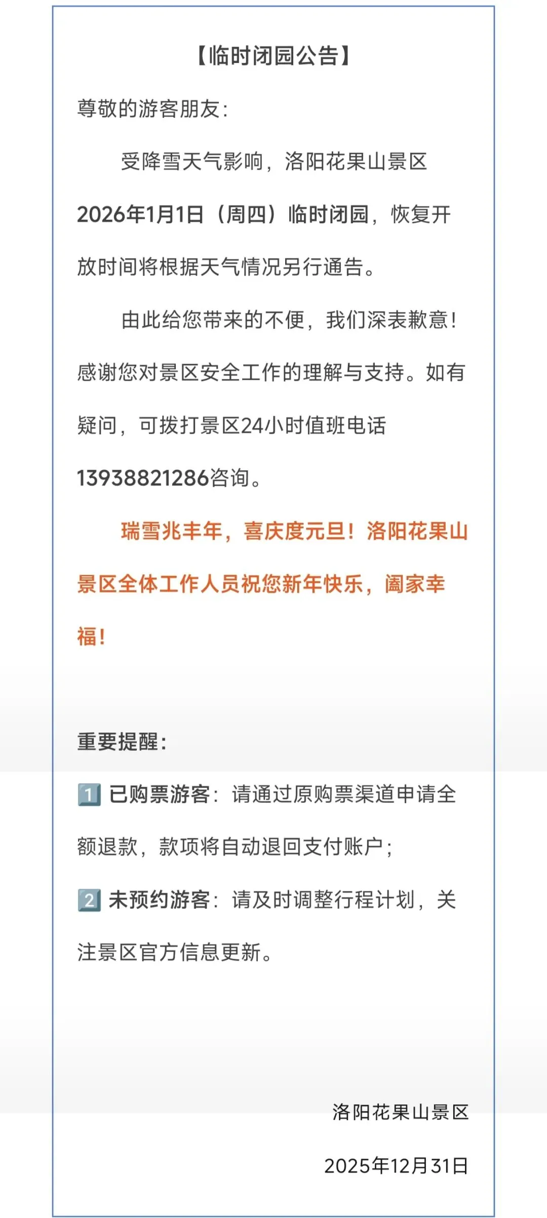 12月31日,从洛阳老君山、陕州地坑院等景区了解到,受降雪天气影响,景区已经采取临时闭园(限流)措施,有游玩计划的朋友请提前关注天气变化。