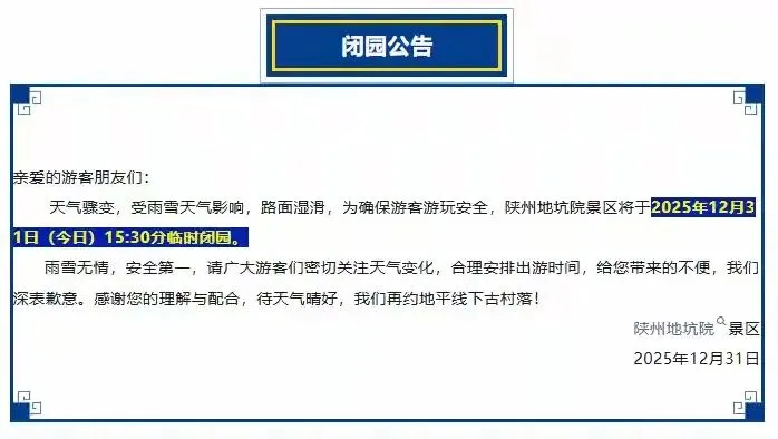 天气骤变,受雨雪天气影响,路面湿滑,为确保游客游玩安全,陕州地坑院景区于2025年12月31日(今日)15:30分临时闭园。
