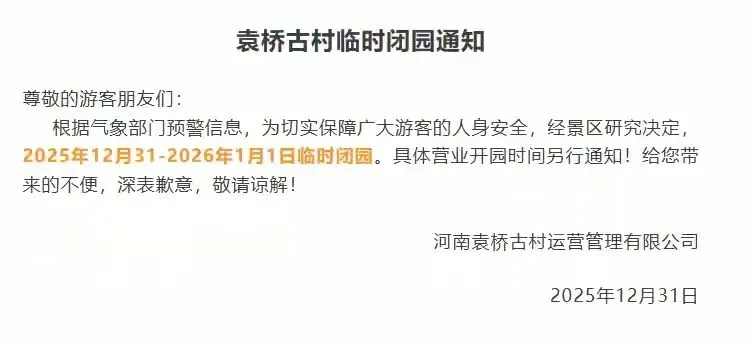 根据气象部门预警信息,为切实保障广大游客的人身安全,经景区研究决定,2025年12月31-2026年1月1日临时闭园。具体营业开园时间另行通知!