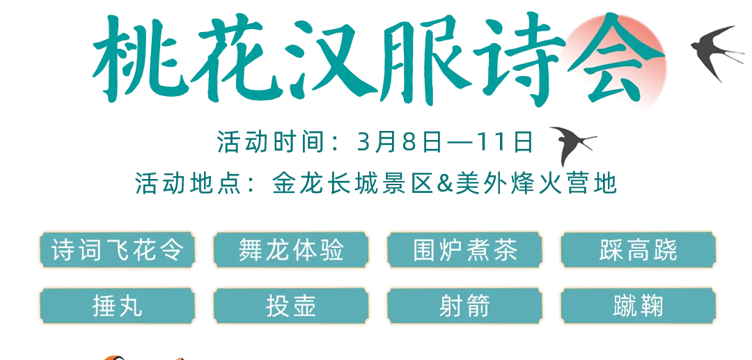 汉服游园诗会:3月9日 14:00将于美外烽火营地(金龙长城3号烽火台)举办汉服游园诗会,所有着汉服游客都能免费参与
