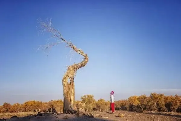 新疆塔里木胡杨林森公园,位于新疆轮台县境内,这里的胡杨林是现存面积最大,保存最完整,景观依旧原始的胡杨保护区。胡杨拥有巨大的生命力—生而不死一千年,死而不倒一千年,倒而不朽一千年。无尽的沙漠,屹立着刚劲的树干,即便已干枯,枝头却仍未停止新生。在这漫漫黄沙中将生命赋予另一种顽强的定义。搭乘复古的小火车穿过数百公里的戈壁荒漠,穿梭在漫山遍野的金色画卷中。抬眼望去,绚烂的金黄点亮了整个沙漠,十分震撼!