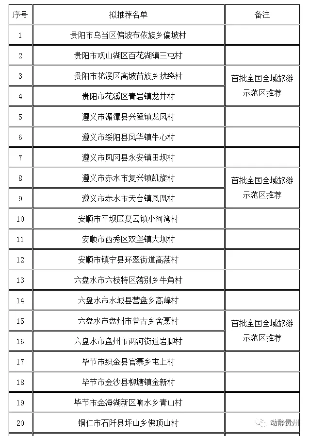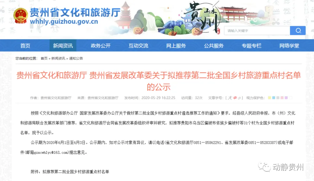 贵州31个村拟推荐为全国乡村旅游重点村!快看有你家乡吗?按照《文化和旅游部办公厅 国家发展改革委办公厅关于做好第二批全国乡村旅游重点村遴选推荐工作的通知》要求,经县级人民政府申报,市(州)文化和旅游局联合发展改革部门推荐,省文化和旅游厅会同省发展改革委组织评审并研究,拟推荐贵阳市乌当区偏坡布依族乡偏坡村等31个村为全国乡村旅游重点村名单,现予以公示。 公示期为2020年6月1日至6月3日。公示期内,如对公示对象有异议,请以电话(省文化和旅游厅0851—85862291、省发展改革委0851—85283387)或电子邮件(邮箱gzxcwhlyc@163.com)提出意见。 贵州省文化和旅游厅 贵州省发展改革委 2020年5月29日 拟推荐第二批全国乡村旅游重点村名单 (未排名) 动静贵州