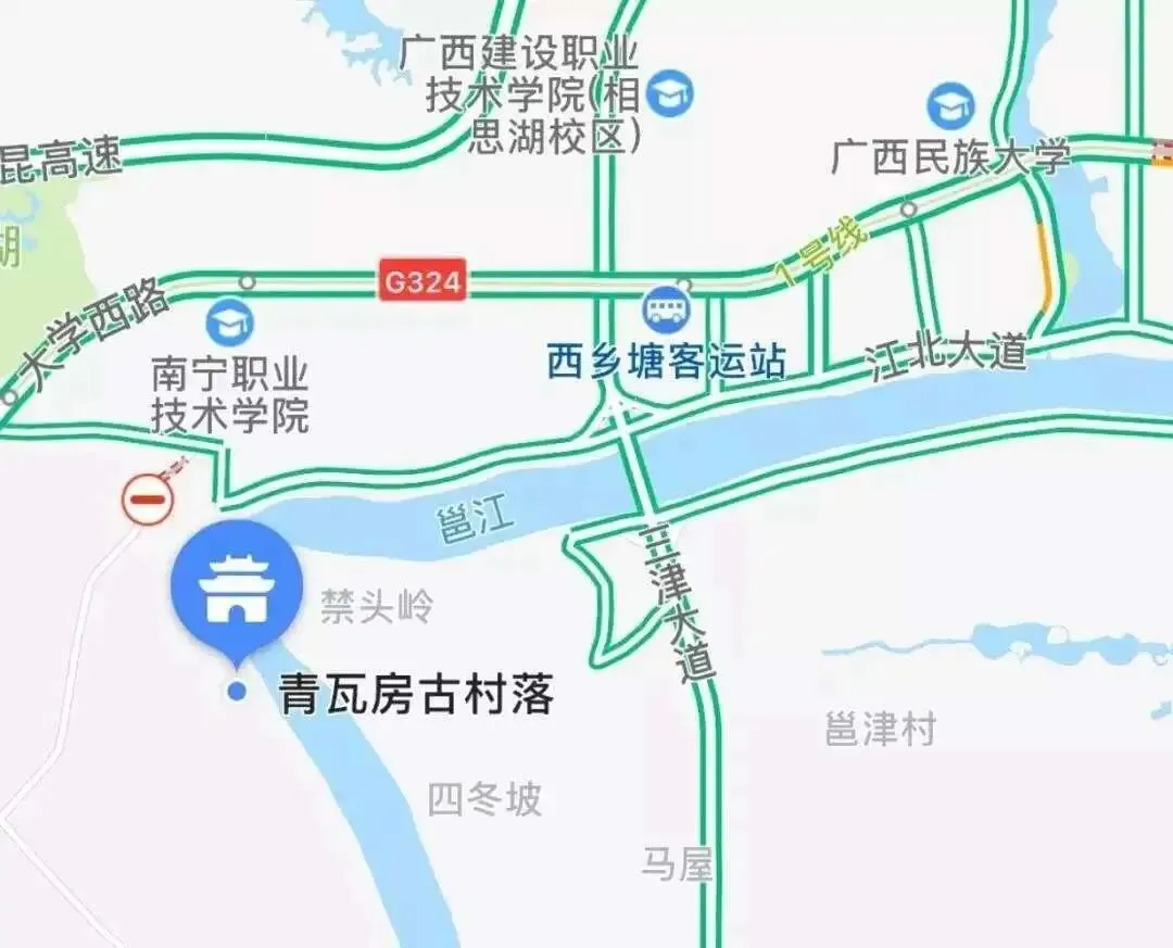 南宁市内进入江北大道沿邕江边一直往西,到达尽头(丁字路)往左拐,沿邕江边河提路行驶500米即到。或百度、高德地图搜“青瓦房古村落”即可。