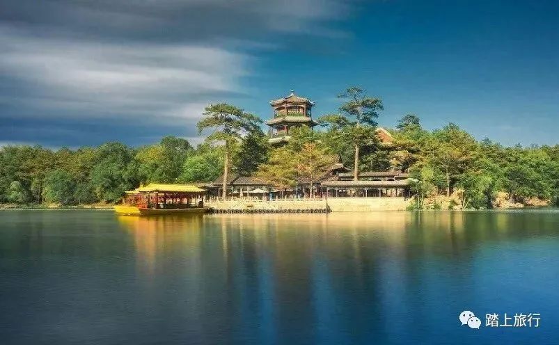 据记载,金山岛始建于康熙四十二年,仿镇江金山寺而建。岛上堆砌假山,山上筑殿,面宽五间,康熙御题"镜水云岑",循石级而上,抵达"天宇咸畅"。岛上最高点北建有三层木塔,题名"上帝阁",为清帝祭祀真武大帝和玉皇大帝之所。