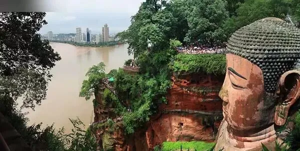 举世闻名的乐山大佛坐落于岷江、青衣江、大渡河三江交汇之处,是8世纪人们在一座山岩上雕凿出来的,是世界最大的一尊摩崖石像,为世界文化与自然遗产。