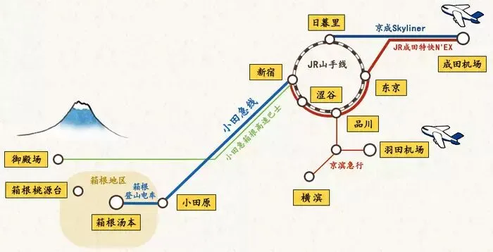 路线/时间:东京/品川-(乘JR光号hikari/回声号kodama)-小田原-(乘箱根登山铁路)-箱根汤本