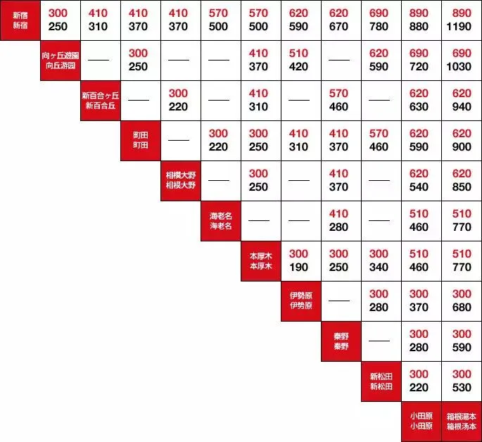 乘坐小田急“浪漫”特快的特快车票价・普通票价(单位:日元)