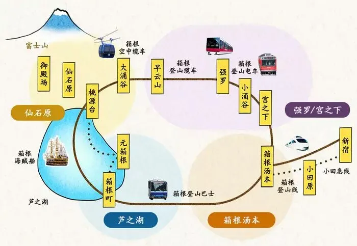 箱根内部交通方式有:登山电车、登山缆车、空中缆车、海贼观光船、登山巴士。