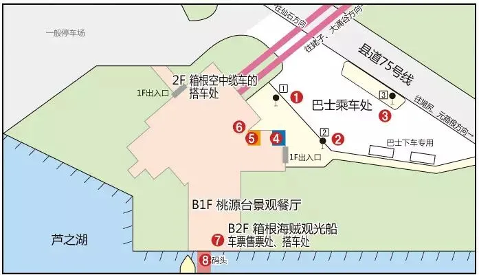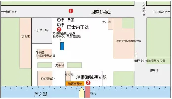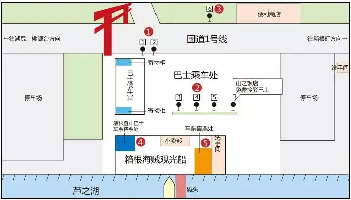 交通:从箱根湯本車站乘坐箱根登山巴士(H路线)约38分钟,在“元箱根港”汽车站下车,徒步约10分钟