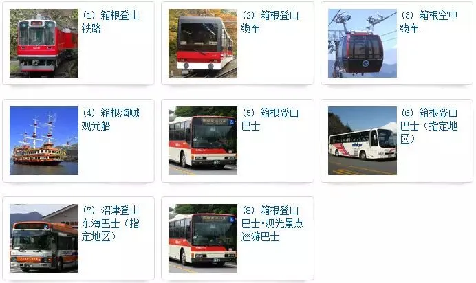 可在箱根地区使用周游票乘坐以下8种交通工具。