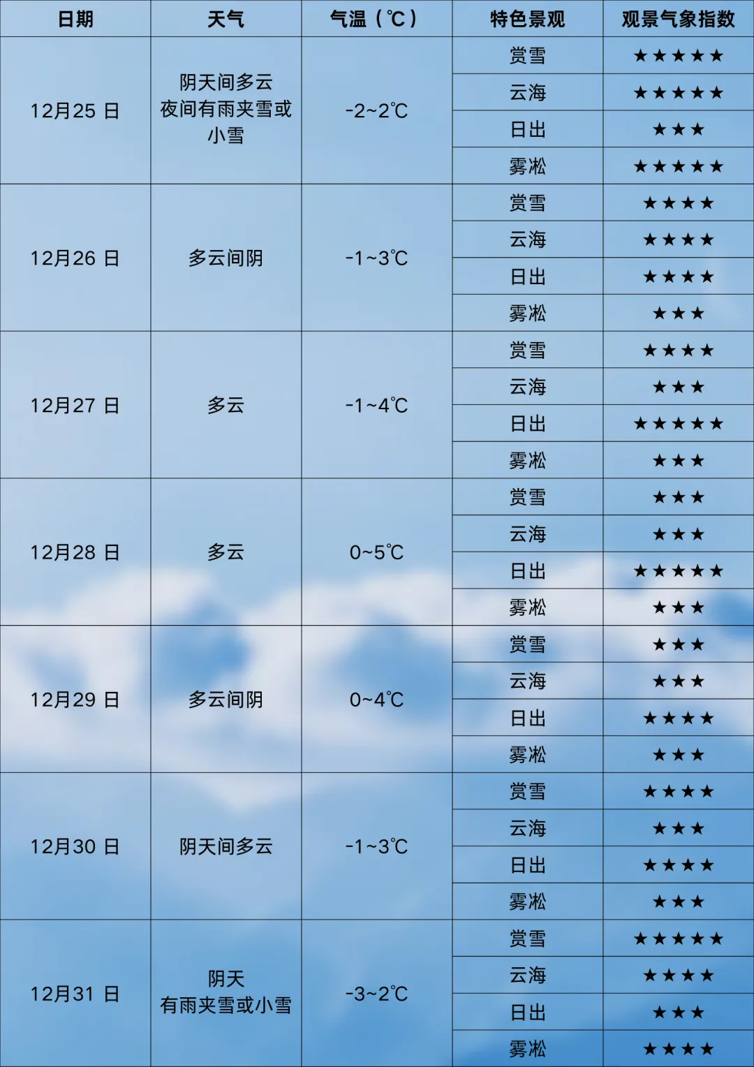 • 最佳时段:12月初至次年3月底为积雪期,其中12月中下旬至2月雪质最佳,且寒潮过后的1-3天是观赏云海、雾凇的黄金窗口;景区已恢复运营,鸳鸯池索道运营时间延长至8:30-18:00,日月坪索道至8:30-17:30,可错峰出行避开人流。