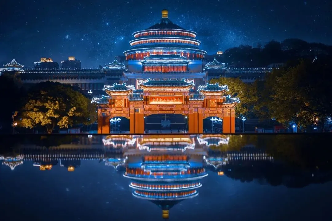 重庆市人民大礼堂建于1951年,是新中国成立以来第一座独具特色的华丽民族建筑,也是重庆十大文化符号之一。外观采用大屋顶民族式,仿明、清时代宫殿建筑,装修和色彩体现传统特色,油漆彩画,雕梁画栋。内部空间呈圆形穹顶,高敞雄阔,自然采光通风。
