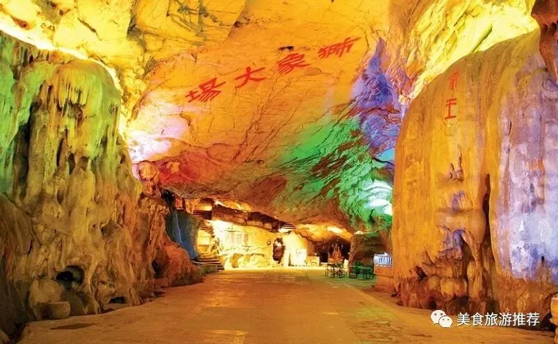 入口在中洞,进去后有一个天然的狮象广场,面积达千余平方米,高达七米的石笋伫立洞口,名曰砥柱峰。广场上面挂满了钟乳石,两侧屹立着一对形似青狮、白象的天然巨石,形态逼真,惟妙惟肖。