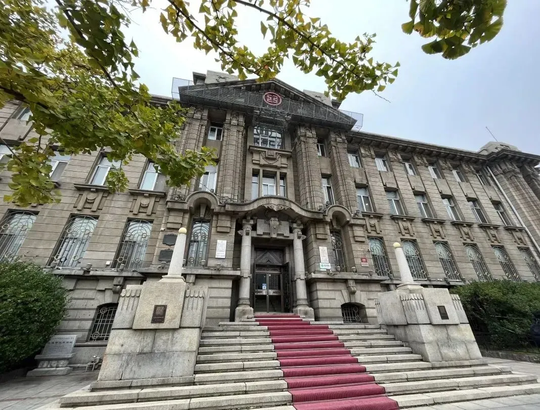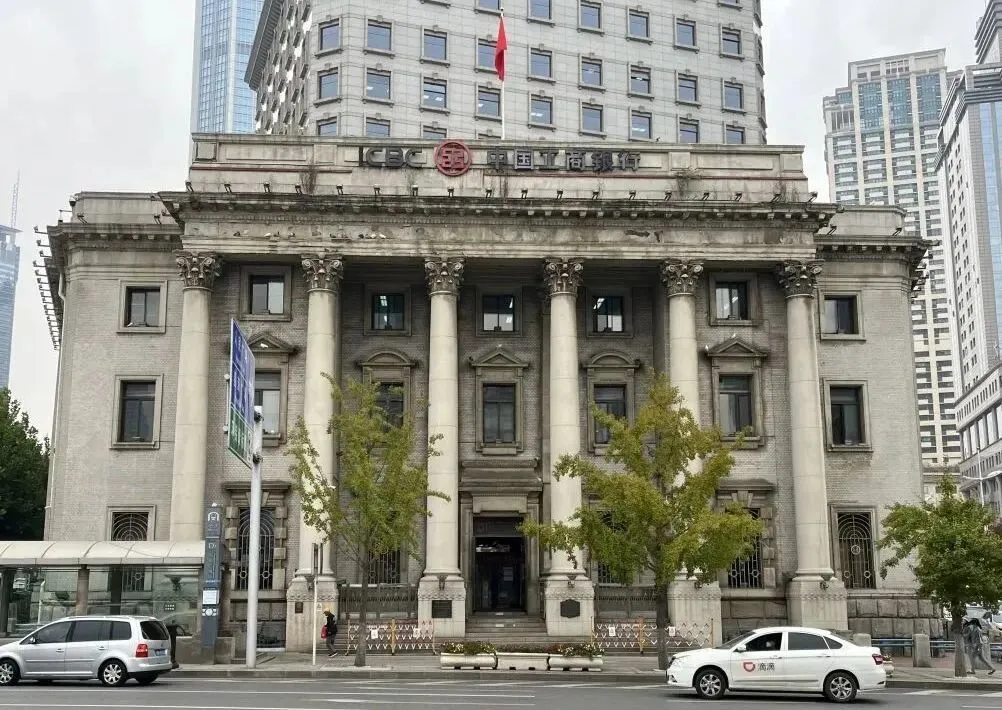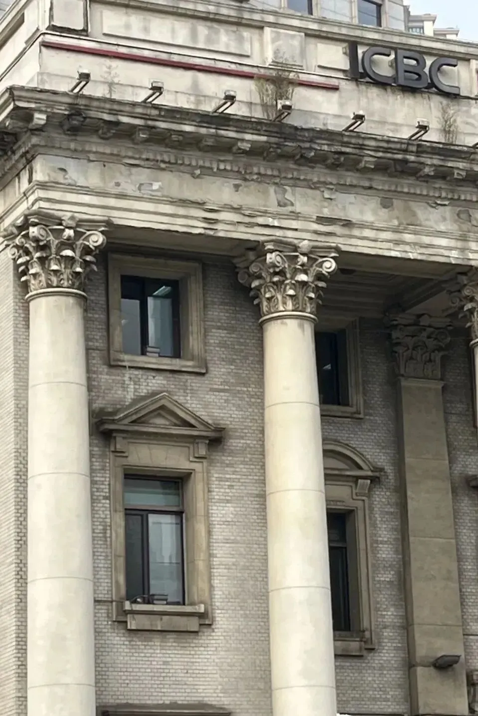 这座楼看上去比较方正,它的立面是古典希腊式风格。这6根柱子叫科林斯柱,它是典型的希腊三大柱式之一。在中山广场的建筑里面,这座建筑像一个厚实的中年人,它的建筑材料下部非常厚实,都是花岗岩,上部用的是釉面砖,设计师控制得非常好,整个色彩是灰调子,感觉非常的内敛,并不是非常的张扬。科林斯柱子的柱头非常的典雅,又很纤细,这个是多多少少带一点华丽的感觉。这栋建筑在中山广场的建筑时间中属于中期,建于1922年。