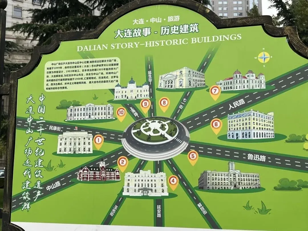 中山广场及其周边区域采用“环形+放射状路网”的巴洛克式城市空间设计手法,塑造了大连特有的“广场+轴线”的城市景观,也是大连现存保护最好的历史文化街区之一。