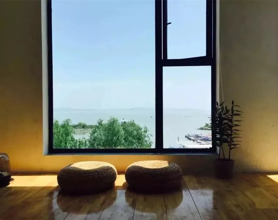 一家极具调调的民宿,选个临湖的房间,拉开窗帘,坐在房间里就能看日出日落。