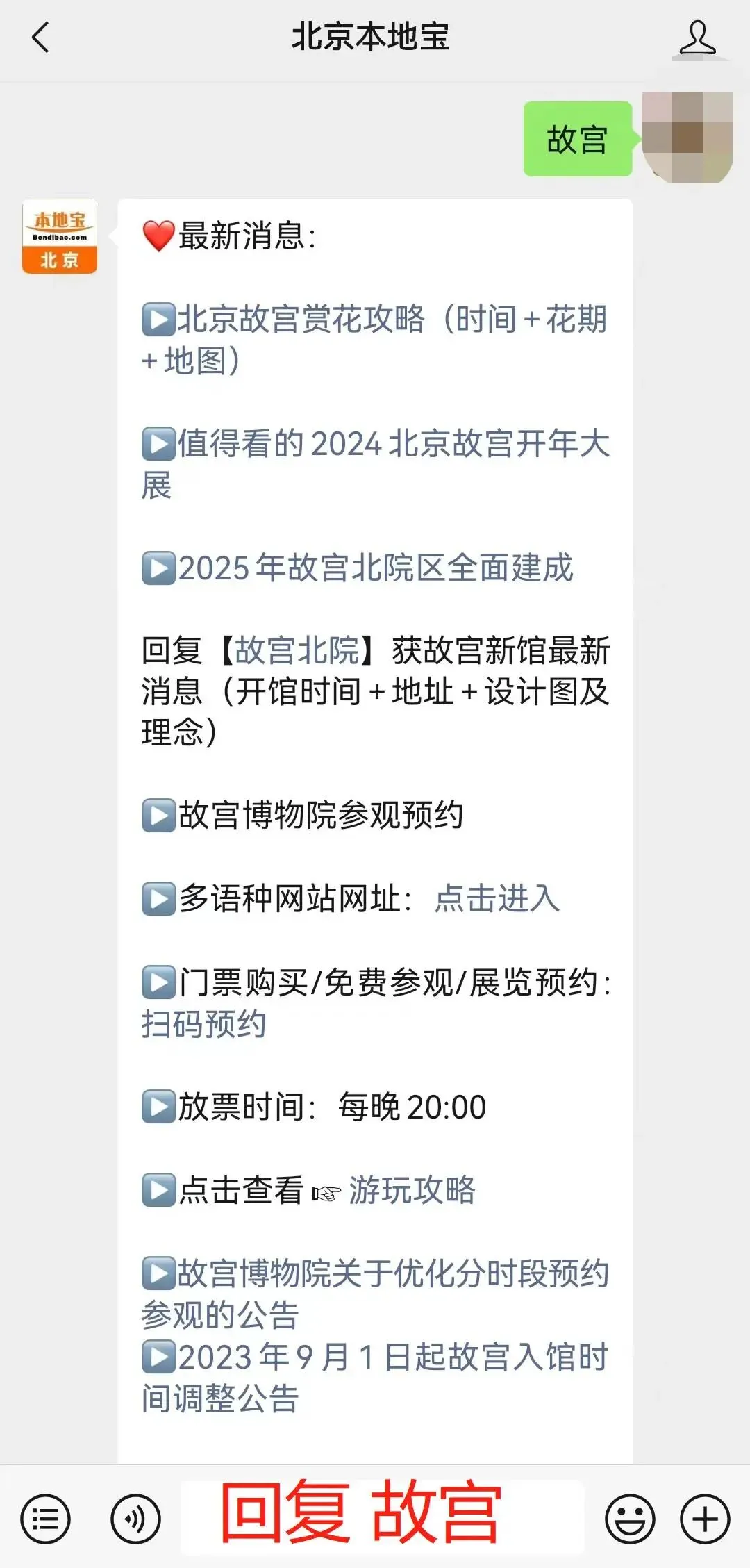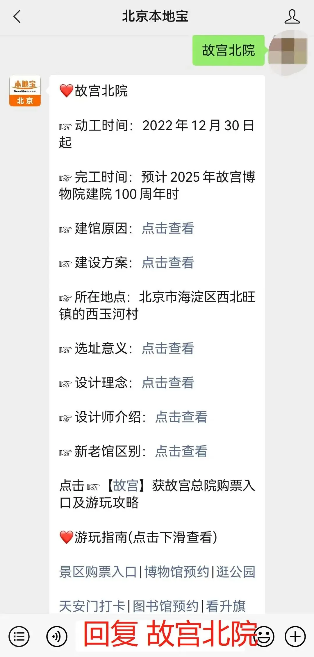 小编有话说:点击下方公众号名片,关注【北京本地宝】微信公众号,在聊天对话框回复【故宫】获取预约购票入口;继续回复【故宫北院】即可获取故宫北院详细介绍(建馆原因、选址意义、设计理念等)、有新消息也将及时更新