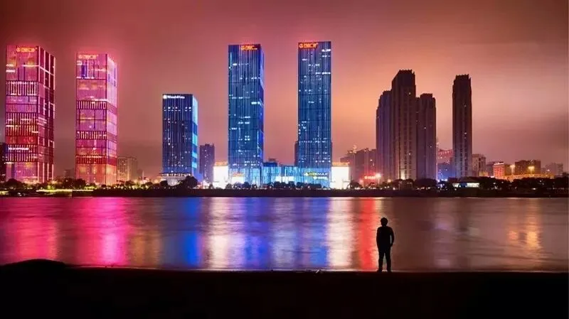 远远地还能看到建筑上的光,闪耀在湘江的上空。湘江是长沙的母亲河,它由南至北流过韶山进入长沙城,经三汊矶又转向西北,至乔口而出望城县,再过岳阳入洞庭,流经长沙市内约25公里,构成了景色秀丽的长沙沿江风光带。