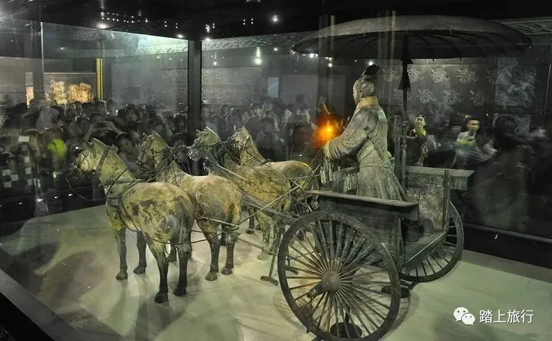 整个兵马俑有三个俑坑,呈品字形排列,是世界最大的地下博物馆。其中,一号俑坑呈长方形,四面有斜坡门道,坑中的武士俑、战车与实物大小相差无几;二号坑有陶马、战车及青铜兵器;三号俑坑则更为特别,三步一岗、两步一哨,戒备森严,显然是战时的指挥中心,一切作战计划、军事命令都在这里形成、下达。