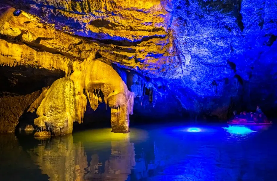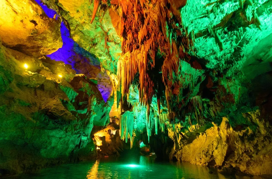 特色:本溪水洞是数百万年前形成的大型石灰岩充水溶洞,被誉为“人间独一此洞天”和“北国一宝、天下奇观”。洞内深邃宽阔,钟乳石发育良好,形态各异。